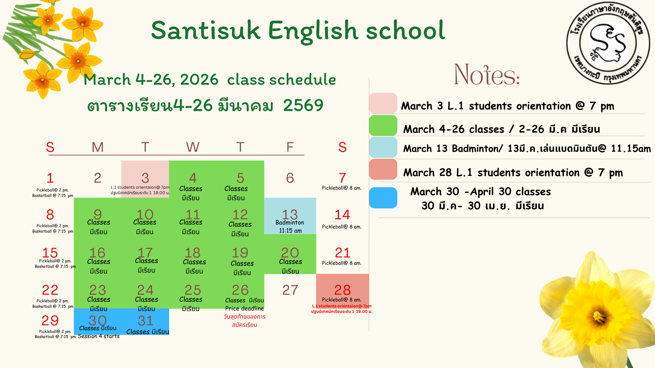 เรานำเสนอหลักสูตรที่ยอดเยี่ยมทุกเซสชั่นนอกเหนือจาก ชั้นเรียนการเตรียมความพร้อมในระดับ (Pre-Level 1) และ ระดับ 1-5 (Levels 1-5) เรามีการอ่านขั้นพื้นฐาน 1-3 (Basic 1-3), Parts of Speech 1-3, ไวยากรณ์ผ่านบทสนทนา (Grammar Through Dialogues), การสนทนาขั้นสูง (Advanced Conversation) และการเขียน (Writing)