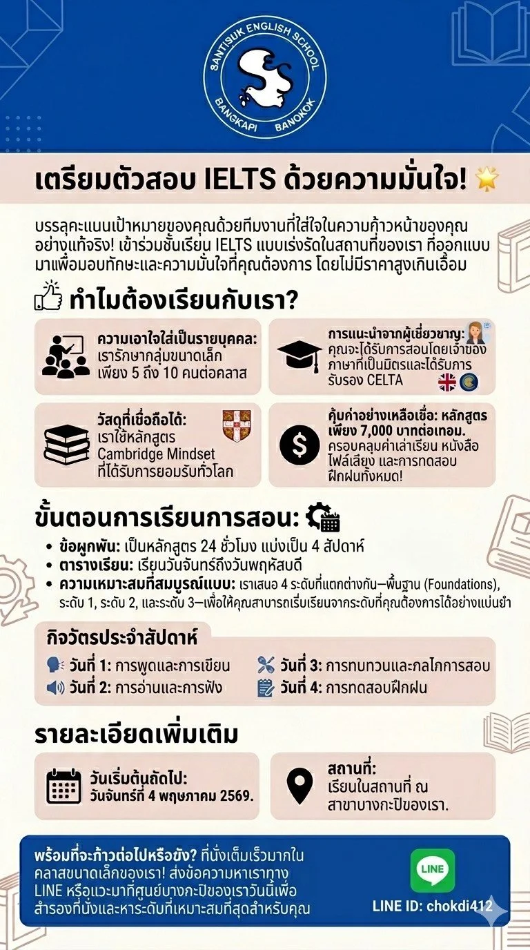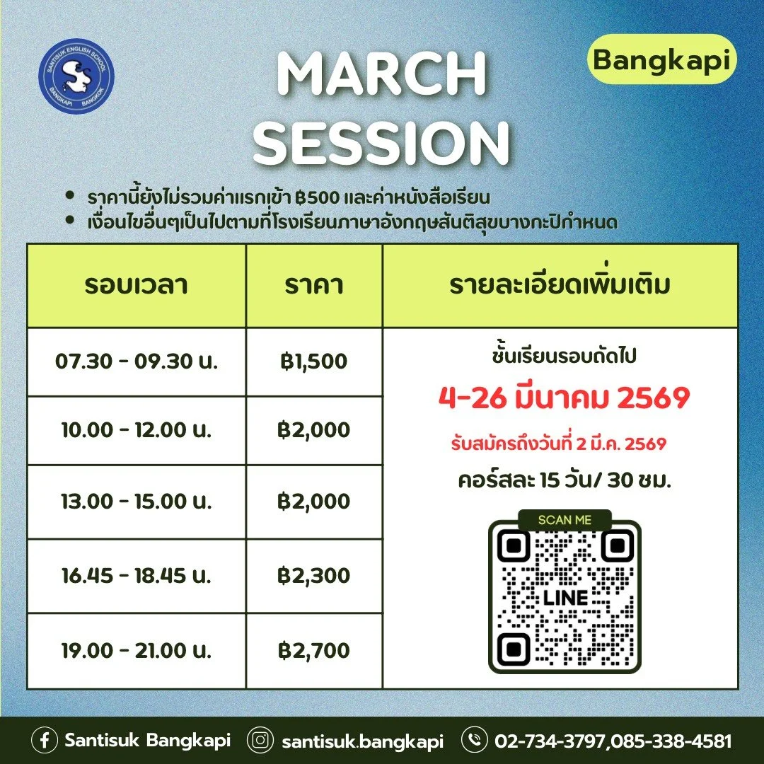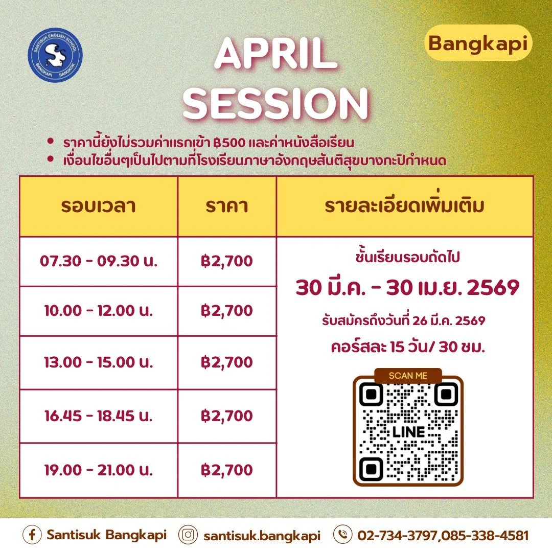 ช่วงที่ไม่มีชั้นเรียนในแต่ละเทอม คุณได้ใช้เวลาว่างให้เป็นประโยชน์เพื่อฝึกภาษาอังกฤษบ้างไหม? คุณอยู่ในเกณฑ์ใดระหว่าง 1-10? ที่สันติสุข ชั้นเรียนภาษาอังกฤษของเราไม่เพียงแต่จะออกแบบมาเพื่อสอนกลไกของการสนทนาภาษาอังกฤษเท่านั้น แต่ยังส่งเสริมให้คุณได้ฝึกพูดภาษาอังกฤษนอกชั้นเรียนด้วย มีวิธีใดบ้างที่คุณสามารถฝึกภาษาอังกฤษ? ดูรายการโทรทัศน์ภาษาอังกฤษ ฟังเพลงหรือเรื่องเล่าภาษาอังกฤษ และแน่นอน พยายามสนทนาภาษาอังกฤษกับเจ้าของภาษา และใช้เวลาที่สันติสุข เมื่อก้าวออกไปทีละนิดเป็นประจำ ภาษาอังกฤษของคุณจะพัฒนาขึ้นอย่างแน่นอน!